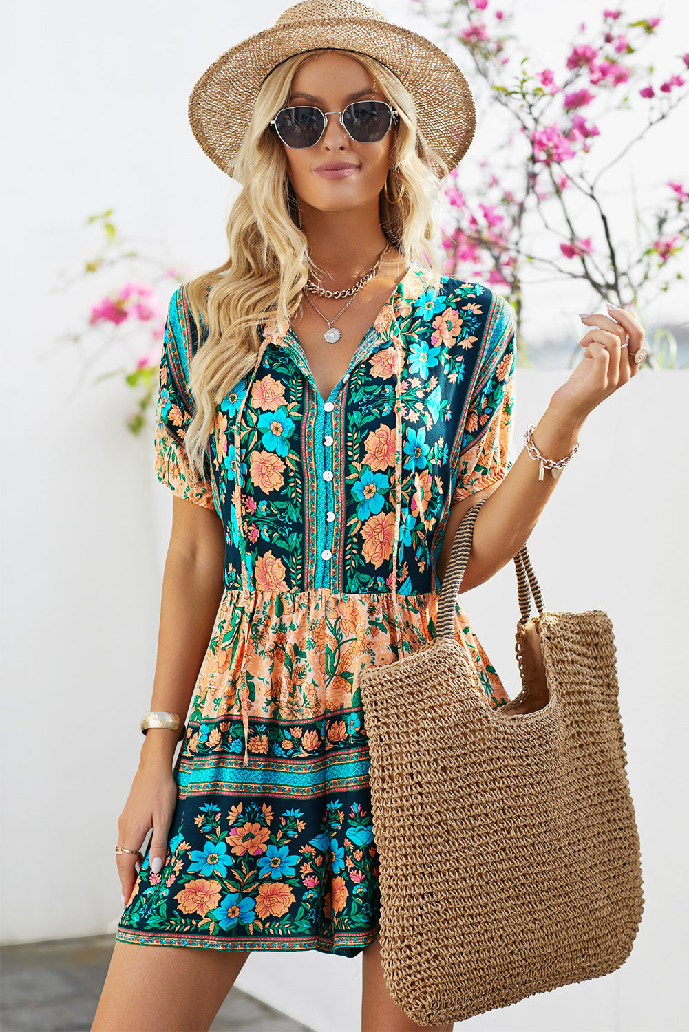 Show off your boho-chic style in this tie-neck romper. Short sleeves and a short length make this piece perfect for wearing with your favorite sandals on a summer vacation or even around town.
